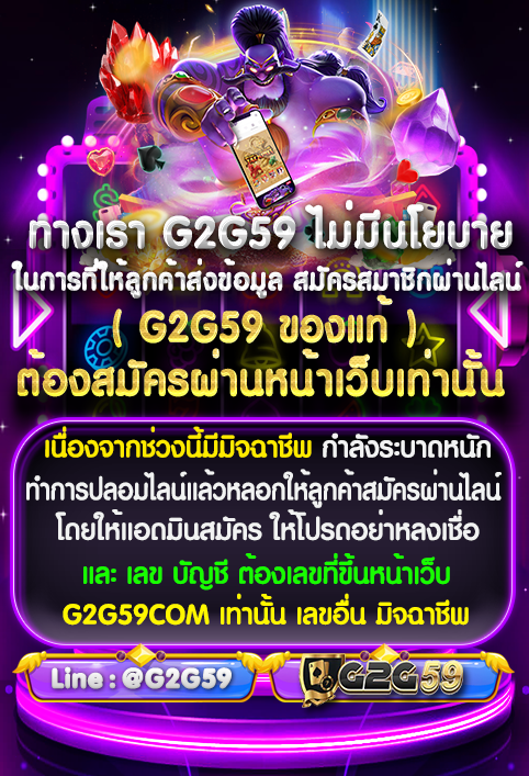 G2G59.COM เว็บไซต์เดิมพันเกมสล็อตออนไลน์รวมทั้งเว็บสล็อต ฝาก-ถอน อัตโนมัติผ่านระบบอัตโนมัติ รองรับทุกแอพพลิเคชั่น G2G59.COM ทั้งเว็บสล็อต pg ทำธุรกรรมเร็วสุด รวมเกมสล็อตมากกว่า 1,000 เกม สมัครสล็อต PG สมัครไม่มีขั้นต่ำ ได้เงินจริง พร้อมทำเงินกับเว็บสล็อตอัตโนมัติตามใจคุณ . มาร่วมสนุกกัน!